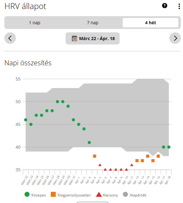 Nem azt mondom hogy nem is lehet; de sem az éjszakai, sem egy sima mérés nem igazán mutatott kevesebbet. Eleve elég nehéz 10/10 úgy mérni, hogy +/- 1%-nál ne legyen nagyobb eltérés.Ellenben a HRV-vel, ami szépen épült lefelé, és ment masszív pirosba, ez egy tavaszi hónapom pl: (Nyilván body battery, edzési felkészültség, alvási pontszám is alacsony volt)