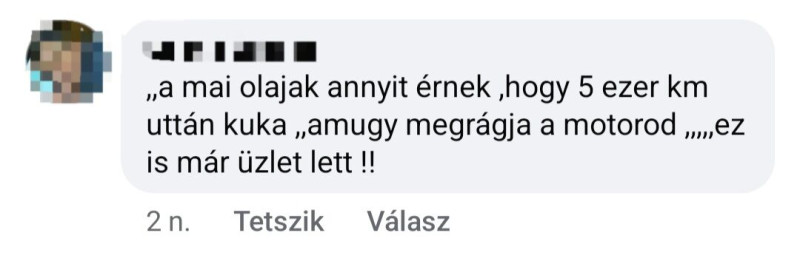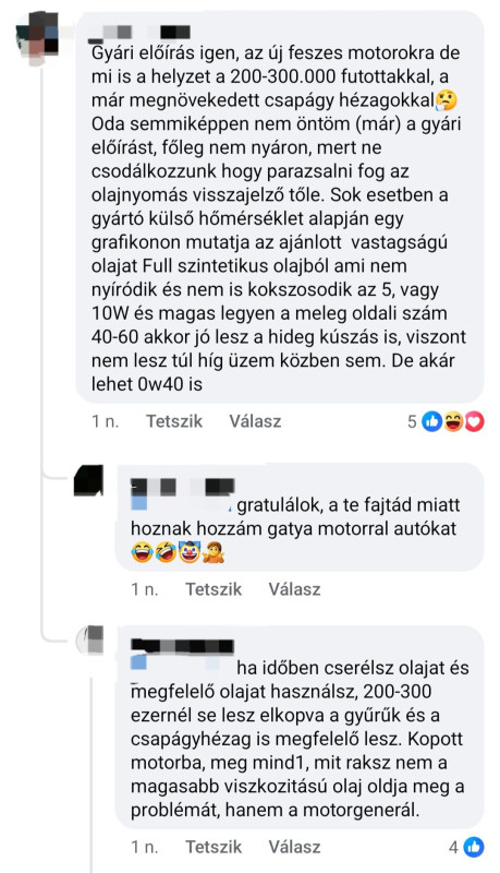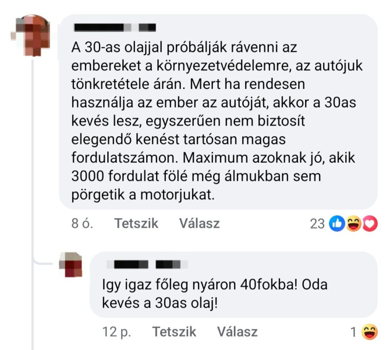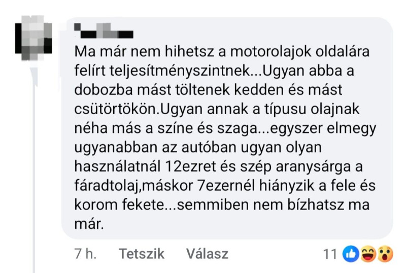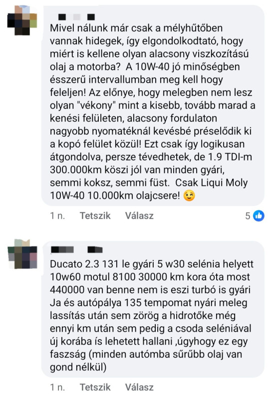 Kontextus nélkül az ilyen kijelentések számomra hiteltelenenk. Míg nem derül ki milyen autó, motor, olaj, periódus és használati mód mellett történt, ezeket a kijelentéseket érdemes fenntartásokkal kezelni.Persze, 10M poltikus, fociszakértő, olajmérnök, stb. országa vagyunk.
