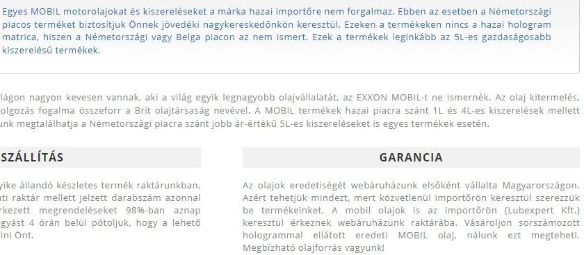 A MOBIL olajok 1L-es kiszerelését a hazai importőr (Lubexpert Kft.) sorszámozott hologrammal látja le, hogy az olaj eredetiségét biztosítsa a vásárlóknak.