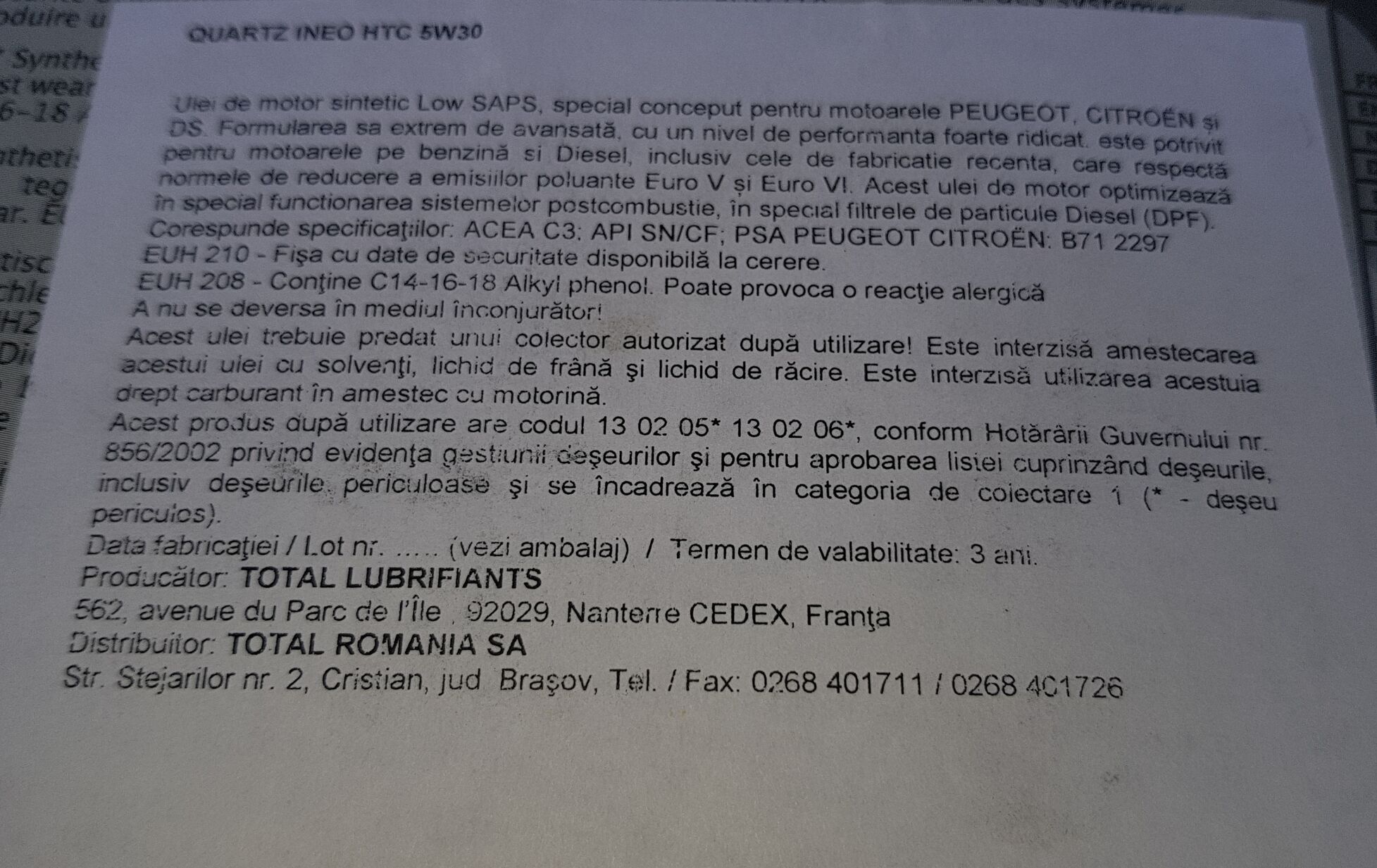 A citroenbe rendeltem a Kovács Autótól Total ineo HTC 5w30-at. A régi dobozos jött,2019-es dátummal. Ez még nem is lenne baj, de made is E.C. és valami romániai cimke van rajt. A total romániai üzemében készült volna?