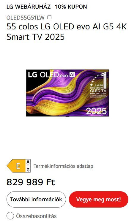 Magyar nyitó árak: 77G5: 1.45m Ft; 65G5: 1.04m Ft; 55G5: 0.83m FtValami megváltozott az árképzésben LG oled fronton. Nem elég, hogy jelentősen olcsóbban indultak az árak a német nyitó árakhoz képest, de még az elmúlt évek hazai áraihoz képest is. Ezt megfejelve most azt látom, hogy már a bevezetés hónapjában -10% kupon van az 55G5-ön, ami alapból elég meglepő (ilyen hamar sosem volt még akció/kupon az elmúlt 10 évben), pláne a "nyomott" árú nyitóárak függvényében érdekes (55G5W: 830e nyitó => 749e kuponnal kontra német ár 1,1m).