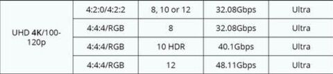 Most a valóságról beszélgetünk, vagy az elméleti megvalósításokról? Úgy általában a 4K@120Hz nincs támogatva, de az ezt meghajtó hardverek meg még inkább nincsenek sehol. Mondjuk játéknál egy ilyen felbontás mellett ekkora képfrissítés az már nagyon a távoli jövő. Fullos grafika mellett még a 4K@60Hz is kompromisszumos.De amúgy is a sávszélességről volt szó, és a 4K@120Hz se nagyon fér bele 18Gbps-be.