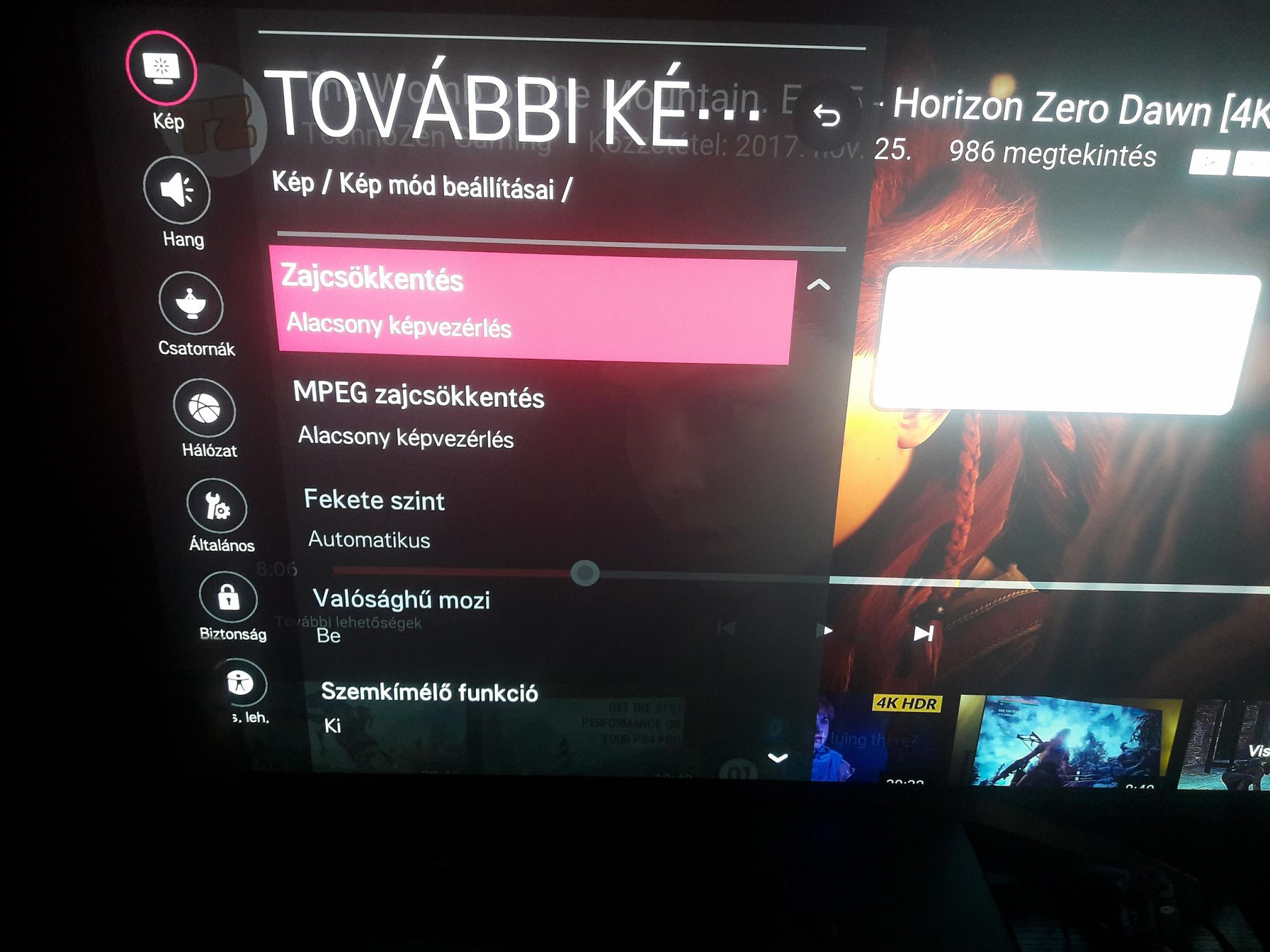 Én is olvastam ezt...De ha ember azt se tudja mit jelent, mér tulajdonítson jelentőséget neki? Meg a videóban se beszéltek róla. Amikor sok a fehér, akkor megy vissza a fényereje, ez lehet akármi. De HDR-ben amúgy is kötelező max-ra rakni az Oled fényt, úgy van értelme. Vagy milyen full screen brightness-re gondolsz? Én gammát mondtam. És ha arra gondolsz, nem az a lényeg, hogy mire használom, hanem hogy nincs az a lehetőség állítani és ez fura. Itt a Valósághű mozi opcióról is kép, hogy nem lehet állítani