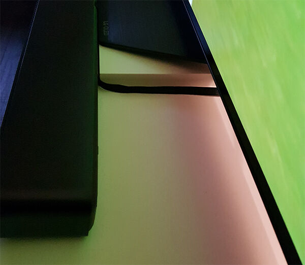 Ez itt a képen az LG BX és egy Sony S40R 5.1-es rendszer hangprojektor része. Vágatnom kellett a TV alá pluszba egy kis bútorlapot, mert az LG olyan talpat csinál ami alá/elé nem fér oda semmi, illetve enélkül kitakar a hangprojektor a képből, és ez egy viszonylag alacsony hangprojektor.