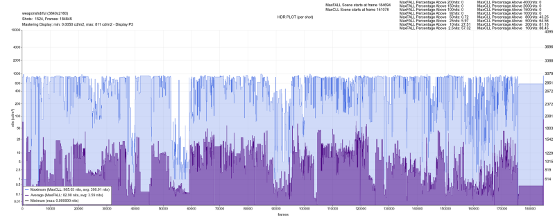 A Fegyverek c film gyári HDR plotja, látszik rajta amiről számtalan alkalommal beszéltünk itt, jönnek az egyre nagyobb fényerőre képes tv-k 2000 nitet tud HDR-ben stb...aztán itt egy mostani HDR film...a 200 nitet sem éri el benne a max csúcsfény. Kb SDR-t nézel HDR-be "csomagolva". Nyilván nem minden film ilyen, de mostanában elég sok ilyen van, és nyilván nem csak ez számít ..de ezt így ebben a formában kár HDR-nek nevezni.