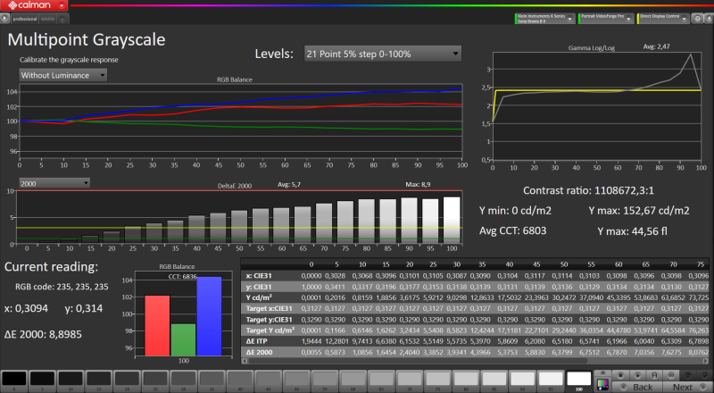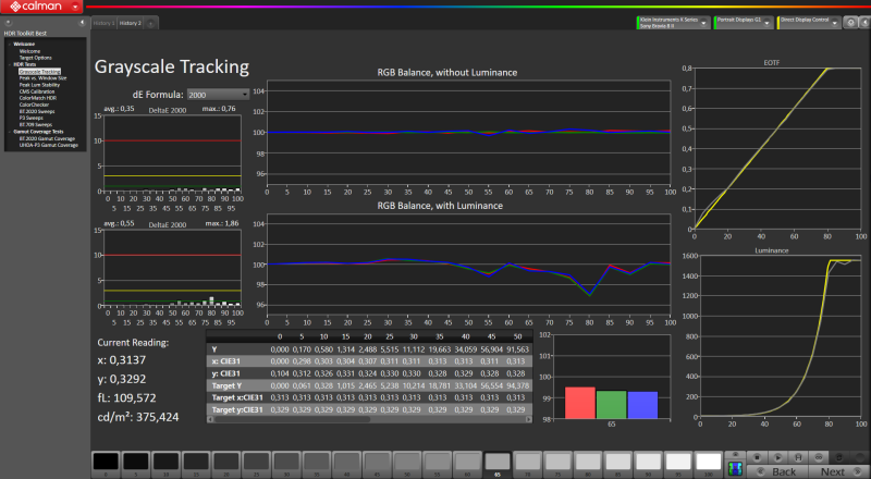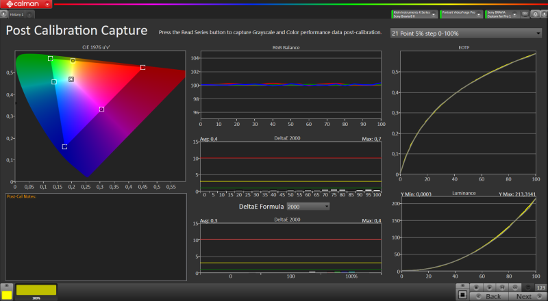 Szerencsére kalibrálás után hatalmasat javul a helyzetmú, lényegében referencia szint közelében vagyunk. Aelég nagy szívás kalibrálni, mert pillanatok alatt vissza veszi a tv a fényerőt (konkrétan elég neki 1 másodperc is), ezt szabad szemmel nem látni, de műszeres mérés során elképesztően tud szívatni, ráadásul ezt akkor is csinálja ha a csúcsfényerő ki van kapcsolva és 100 nit van megcélozva.