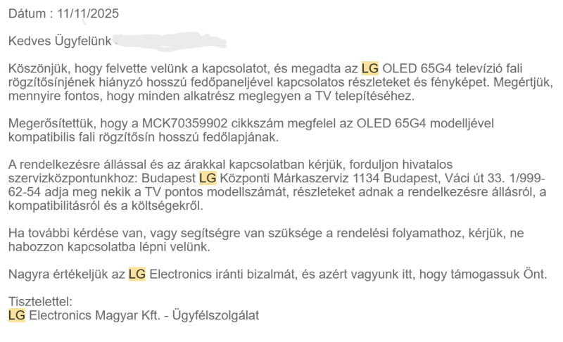 Amikor a 65G4-t vettem, akkor vásároltam hozzá gyári talpat, ahhoz jár a takarólap is. Sajnos eladáskor véletlenül rajtahagytam a G4-n azt a takarót, de a talpat megtartottam, ami szerencsére egyezik a G5-el. Utánajártam, hogy mi lehet a cikkszáma annak a fedlapnak. A chatgpt szerint: MCK70359902 . Ez valós, mert az LG az emailes kérdésemre megerősítette, hogy ez az az alkatrész, majd annyit írt, hogy keressem fel a Váci úti márkaszervizt, amit végül nem tettem meg, mert mégsem zavar, hogy látszanak a csavarok. Tudom, hogy 75-nek kellene a fedlapja, de sajnos arról nem nyilatkozik a chatgpt. Lehet, hogy egy emailt megér az LG felé, hogy ennek a cikkszámú alkatrésznek kellene a 75 colloshoz megfelelő változata.