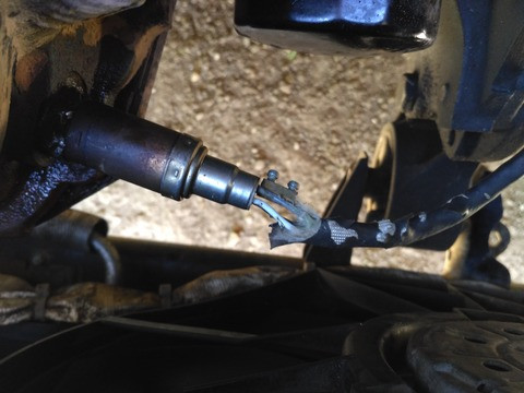 A kora esti lambda szonda csere próba megölt, így most gyenge az idegrendszerem. Másfél méteres rudat használtam erőkarnak és meg sem moccant. Mondjuk mikor levettem a hővédő lemezt akkor már sokkot kaptam. Valamelyik előző tulaj elhagyhatta a lemez alsó csavarját. Semmi gond, kihézagolták a helyet a leömlő és a lemez között felmosófej "szőrrel". Szerencse, hogy nem égett még le az autó.....