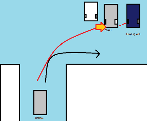 Szóval az ezüsttel jelölt Béjemvé jött és kanyarodni szeretett volna, azonban ez nem sikerült neki, ugyanis full jeges volt az út és a feketével jelölt pálya helyett a piros vonal szerinti pályát választotta pechére. Ugyanis útjában volt az ezüst Vectra, amit gyökkettő sebességgel meglökött, annak sarka pedig a kék