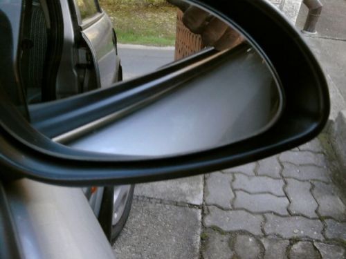 Volt egy kis dolgunk,vittük őt is.Garázsajtót kinyit, de nem támasztotta ki,csak állt mellette,mint aki díszőrséget áll.Én tolattam ki,bal tükörbe néztem hátra, a szél lassan fújta befelé az ajtót,és a tükör a kilincsbe beakadt.Felső burkolat kipattant, a széléből két kisebb darab kitört,tükör oldalra lekornyadt.