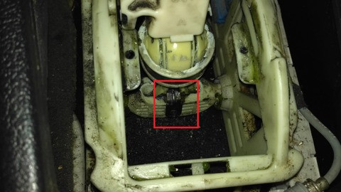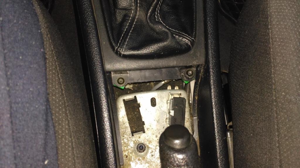 Fel kell pattintani a kézifék alatti borítást majd oldani a váltószoknya keretet rögzítő 2 darab T20-as csavart.Ezután a lenti kép fogad. A bekeretezett stift tartja helyén a váltókart. A stiften van egy rögzítőgyűrű amit bal oldalra nyomással lehet oldani. Ezután kijön a stift majd az egész váltókar.