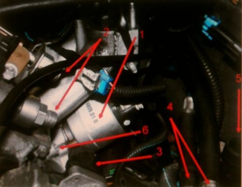 (1) EGR-szelep, (2) benzincsonkok az injektorhídon, (3) alapjárati motor, (4) táp- és visszafolyó benzincső, (5) tágulási tartályra csőcsonk, (6) EGR-szelep rögzítő csavarjai. (2db)Megpróbálhatod még megfelelő hosszúságú,és vastagságú fémrudat a csavarra tenni,és néhány mérsékelt koccal kalapáccsal megütögetni a vasrudat.Valszeg még nem volt megbontva,ezért indul nehezen.Az a baj,hogy a csavarhúzóval nem tudsz kellő erőt kifejteni,de hátha..