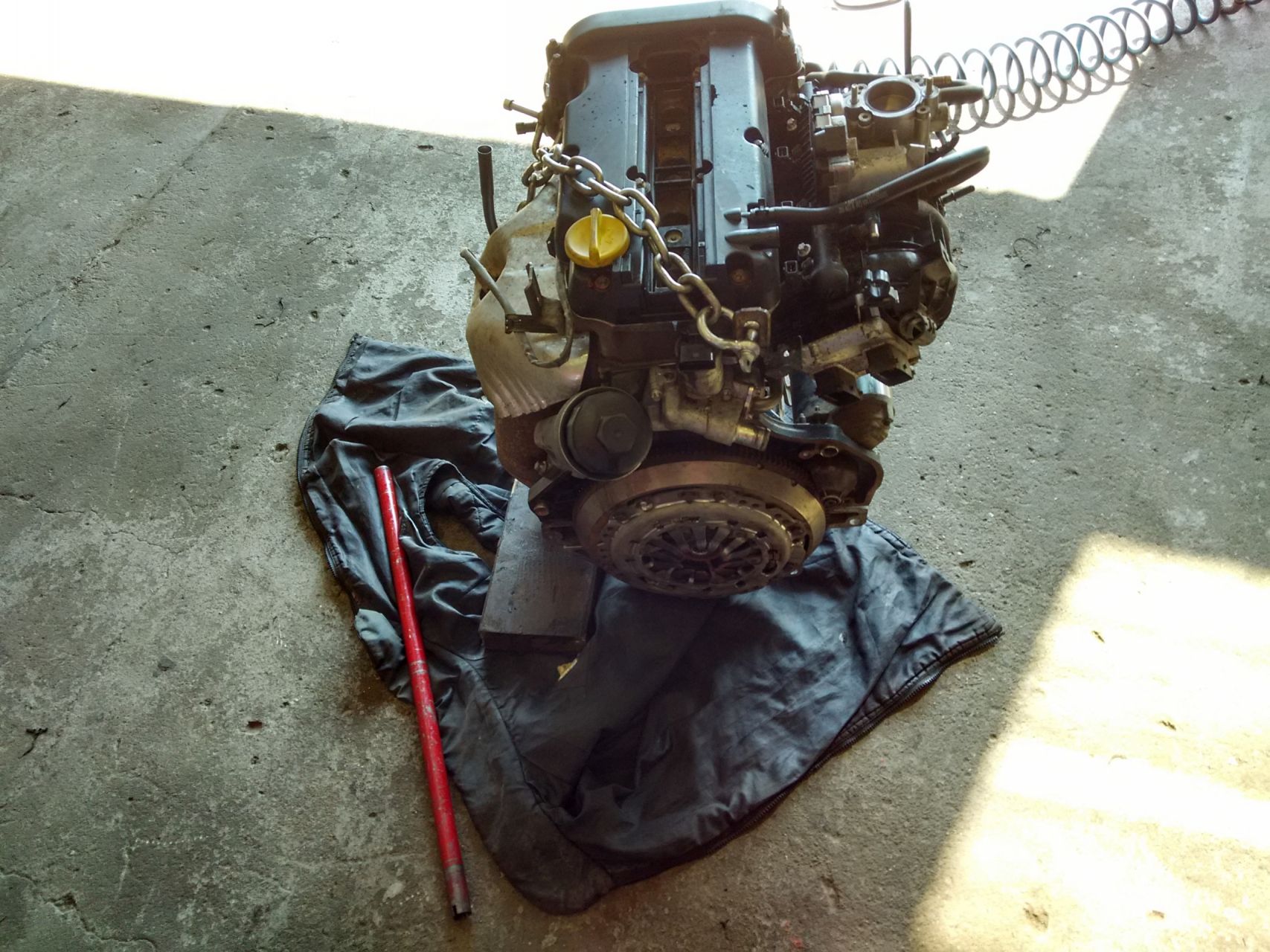Ma jön a motor, közben hamarabb sikerült szereznem, így nem hívtam fel. Egy Olasz Corsa-ból jön, Dunántúlról, most Pest környékén jár. ~90000 km-t futott motor. Már tegnap meg kellett volna jönnie csak nem bontották ki időben. A mostani motor ott lóg a kocsi mellett láncon