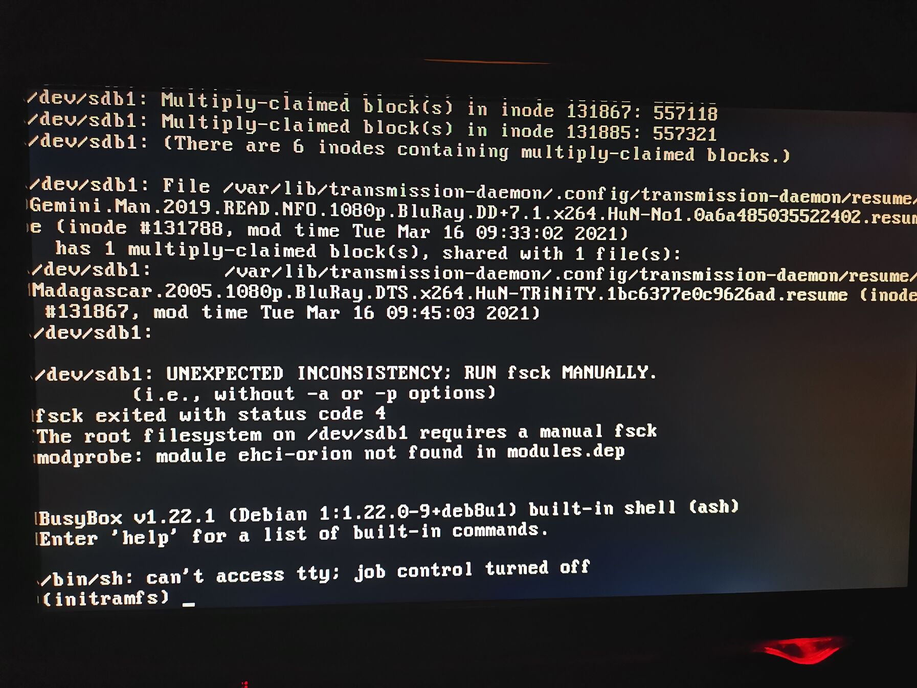 Az összezuhanás: Nem tudtam a rajta tárolt adatokat elérni távolról, de belső hálózatról sem. Próbáltam belépni a webes felületre, nem ment. Majd monitort tettem rá, és a betöltési folyamat alatt hibát dobott, ezt: