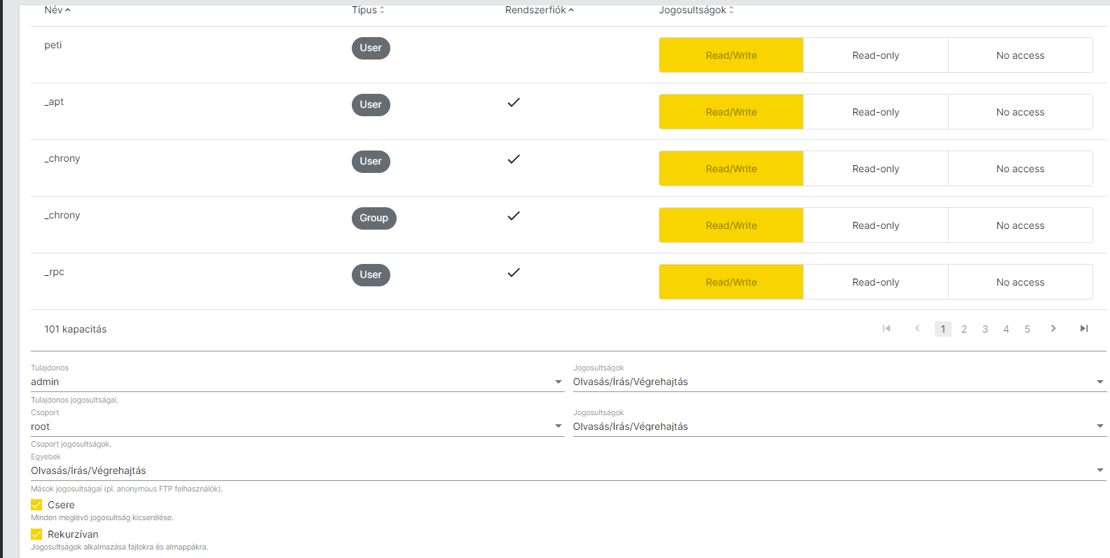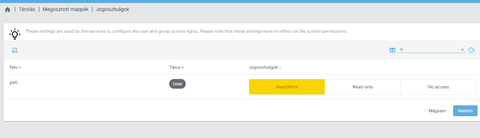 OMV-ben a mappákat, de főleg a torrent mappát, amit OMV hozott létre egy szűz HDD-re, peti userre állitottam be, hogy mindent engedtem neki. Feltehetően ezek 90%-a nem kéne, de majd esetleg vissza vonom a jogokat. Admin-t nem tudom hol kellene használnom, puttyval root-ot használok, máshol meg petit.