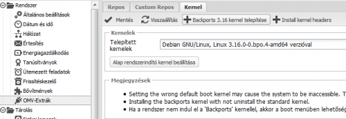 Nem nagy ördöngösség Rendszer-OMV-Extrák-kernel fül-Backports 3.16 kernel telepítése rábök ablak felugrik indítás. Ha végig megy, utána reboot. Az új kernellel fog indulni. A törlés az már bonyolultabb terminálban kell megcsinálni, de azt majd később ha kell. Ha a régebbit akarod indítani akkor csak kiválasztod a Telepített kernelek közül és Alap rendszerindító kernel beállításra nyomsz és legközelebbi indításnál az indul el. Ennyi.