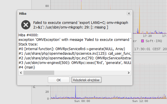 Hiba #0: exception 'OMV\ExecException' with message 'Failed to execute command 'export PATH=/bin:/sbin:/usr/bin:/usr/sbin:/usr/local/bin:/usr/local/sbin; export LANG=C; omv-mkgraph 2>&1' with exit code '2': /usr/sbin/omv-mkgraph: 29: [: missing ]' in /usr/share/php/openmediavault/system/process.inc:175 Stack trace: #0 /usr/share/openmediavault/engined/rpc/rrd.inc(54): OMV\System\Process->execute(Array) #1 /usr/share/php/openmediavault/rpc/serviceabstract.inc(528): OMVRpcServiceRrd->{closure}('/tmp/bgstatus8u...', '/tmp/bgoutputrd...') #2 /usr/share/openmediavault/engined/rpc/rrd.inc(56): OMV\Rpc\ServiceAbstract->execBgProc(Object(Closure)) #3 [internal function]: OMVRpcServiceRrd->generate(NULL, Array) #4 /usr/share/php/openmediavault/rpc/serviceabstract.inc(124): call_user_func_array(Array, Array) #5 /usr/share/php/openmediavault/rpc/rpc.inc(84): OMV\Rpc\ServiceAbstract->callMethod('generate', NULL, Array) #6 /usr/sbin/omv-engined(516): OMV\Rpc\Rpc::call('Rrd', 'generate', NULL, Array, 1) #7 {main}Ha a teljesítmény statisztikát frissítem.