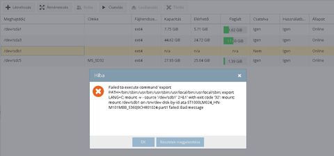 Nálam ebben az esetben a megoldás az volt, hogy a parancssorban (SSH-n belápve) egyszerűen umount-tal lecsatoltam a meghajtót, majd utána a webes felületen felcsatoltam, így most már használható is. -