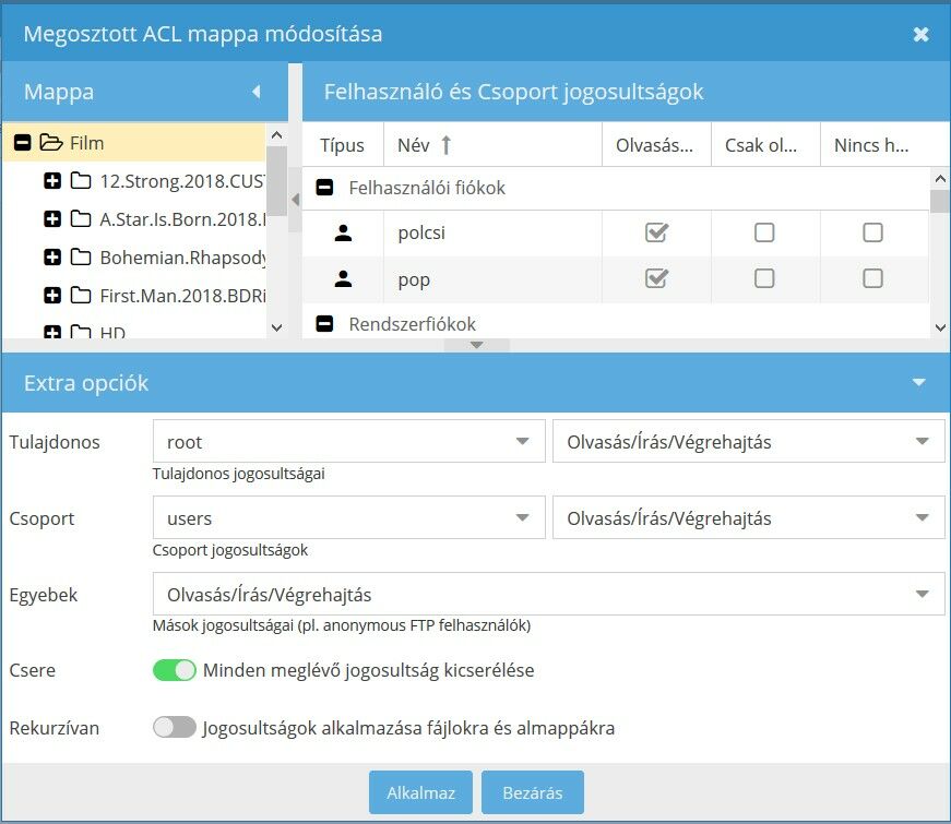 Itt erdekes, hogy hiaba kapcsolom a rekurziv alkalmazast, az mindig visszaugrik off-ra, viszont az almappakon is ott van a user hozzaferes bepipalva.