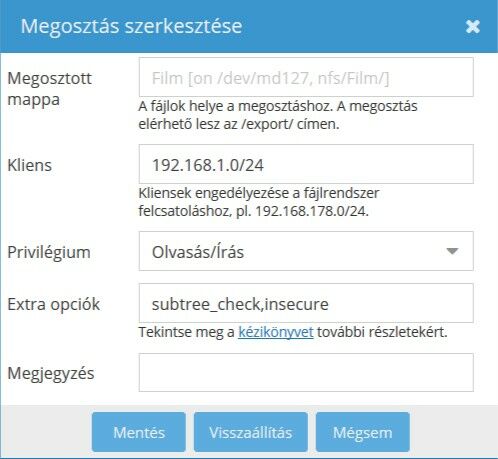 Gondolom az NFS szerver-t sikerült elindítani és a megosztásokat (mappákat) fölvetted a "listára", azaz az OMV webes felületén az NFS oldalon látszanak a mappák....