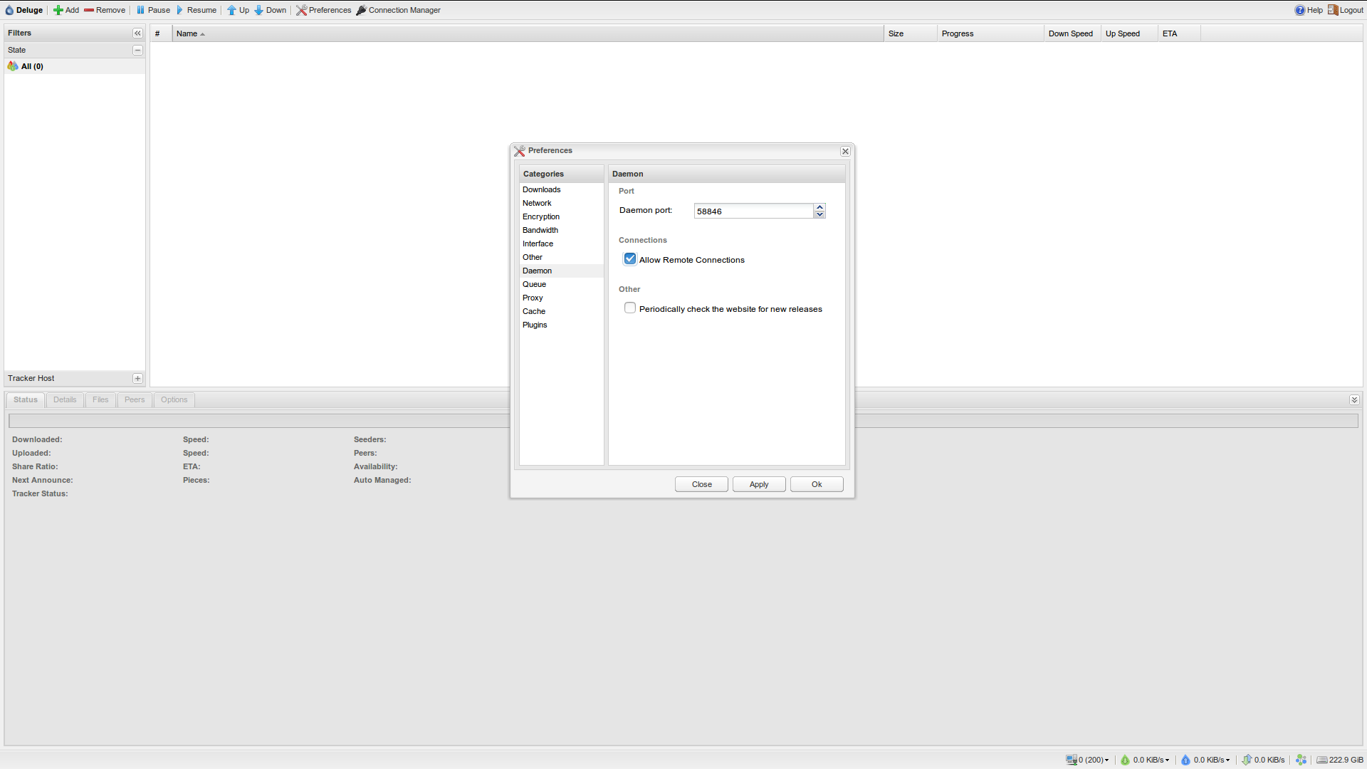 Klienssel úgy tudsz belépni hogy elindítod a Deluge-web-et,belépsz, alap értelmezetten a jelszó "deluge" ezt az első lépésnél módosítod is. Majd Preferences->Deamon Allow Remote Connections engedélyezed.[kép]