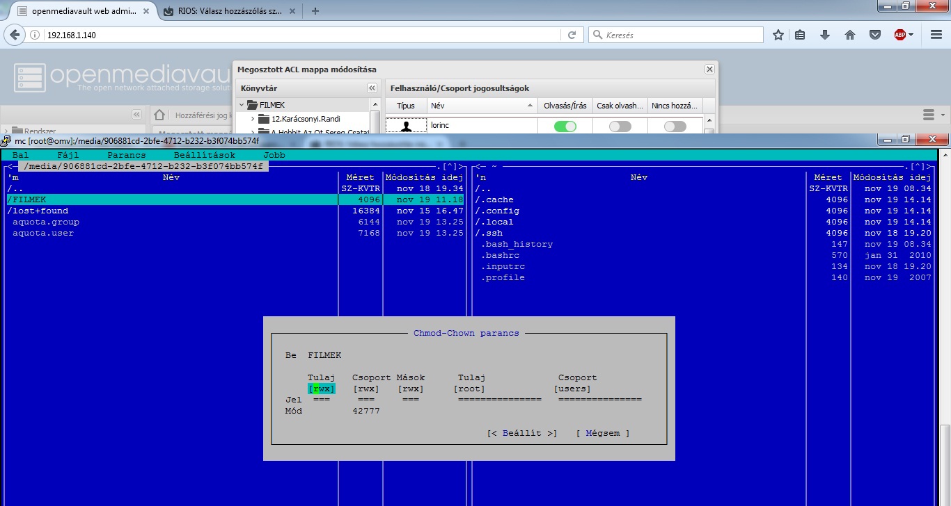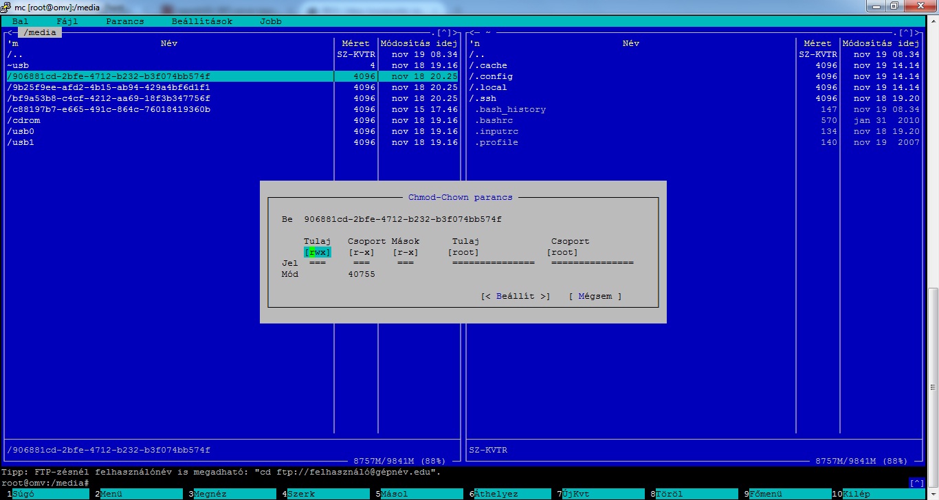 ott a mappára navigalsz és adsz neki jogokat.http://dyra.eu/hu/midnight-commander-mc/midnight-commander-billentyuzetparancsai