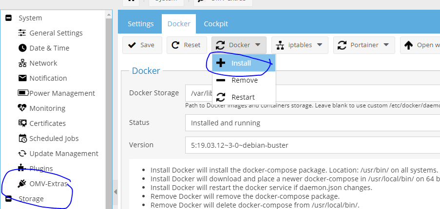 Ahogy a társ írta csak néhány kattintás és telepítve a docker. Fontos! Utána újra kell indítani az OMV-t, hogy biztosan a rendszer része legyen a belső hálózat (kezdő képernyőn is jelzi). Innentől kezdve a háttérben fut és aktiválódik ha telepítünk egy docker alkalmazást.