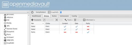 Mutatok példát: 3 vinyó, disk1+disk2 aufs-sal összefűzve, disk1, disk2 adatlemezek a snapraid számára, disk3 paritáslemez.