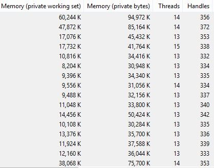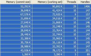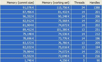 Az első oszlop a "commit size", a második pedig a "working set", harmadik a "threads", negyedik pedig "handles"