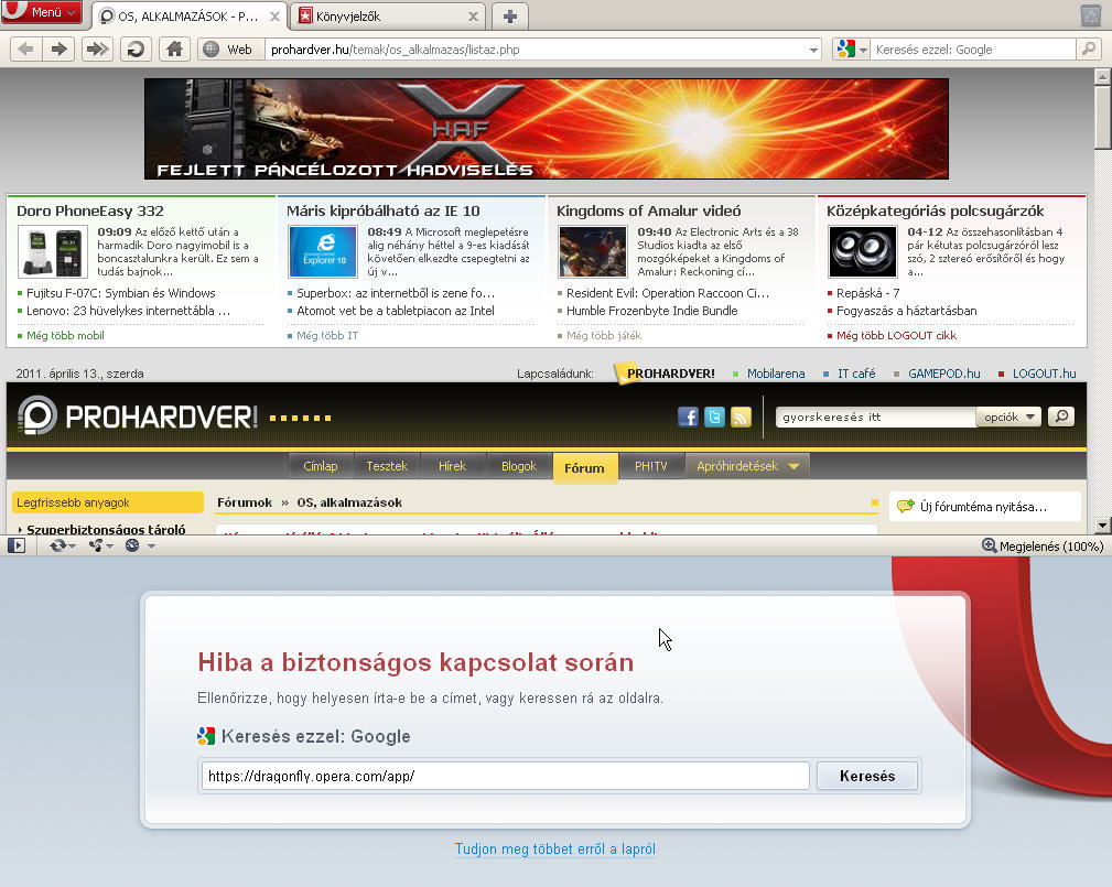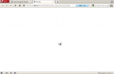 Na, a kedvetekért megint feldobta a talpát a drága. Az opera nem tudta betölteni a maps.google.com-ot (meg a ph-t se tudtam frissíteni, meg semmit), elindítottam a kuglit, és annak jött kapásból. Aztán nyomtam roládot az operában, de továbbra is semmi.