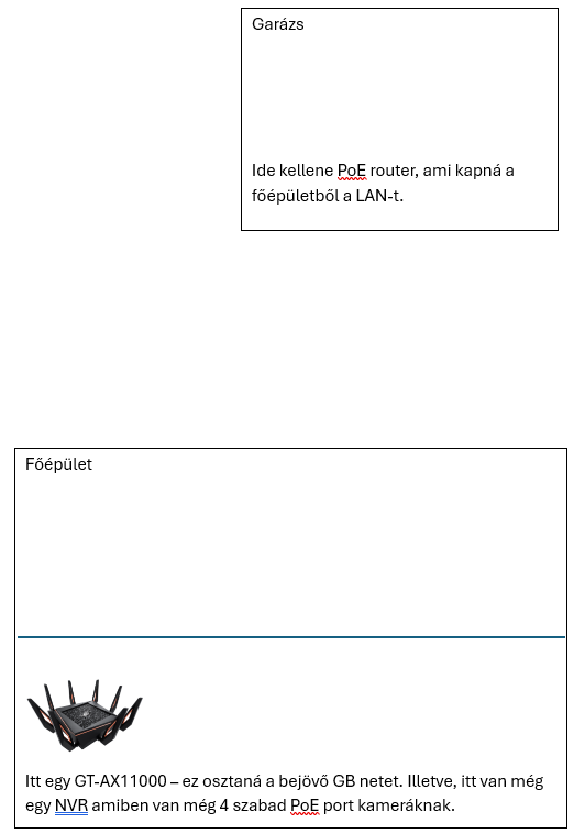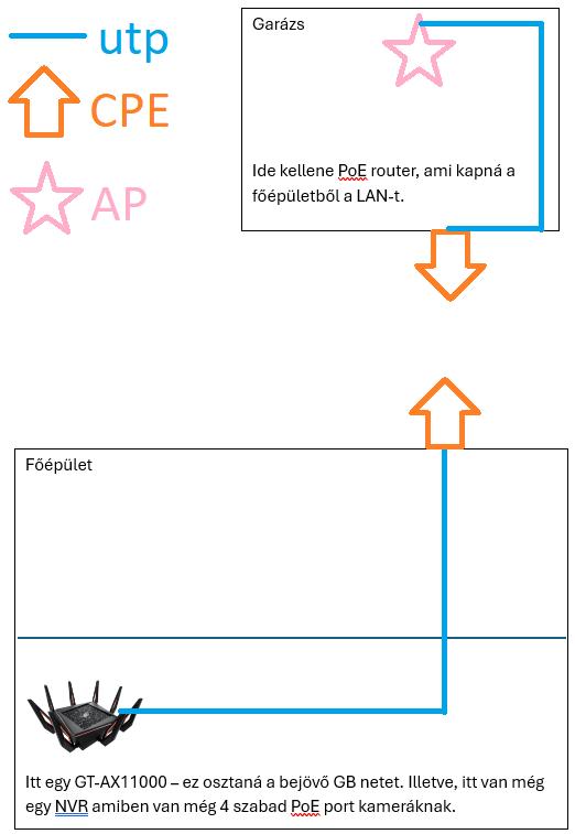A jelenlegi router jele elér odáig, de nem stabil. Továbbá az NVR-be be kéne kötni még két kamerát, ami a garázsnál volna elhelyezve (ezért kellene oda a PoE)...