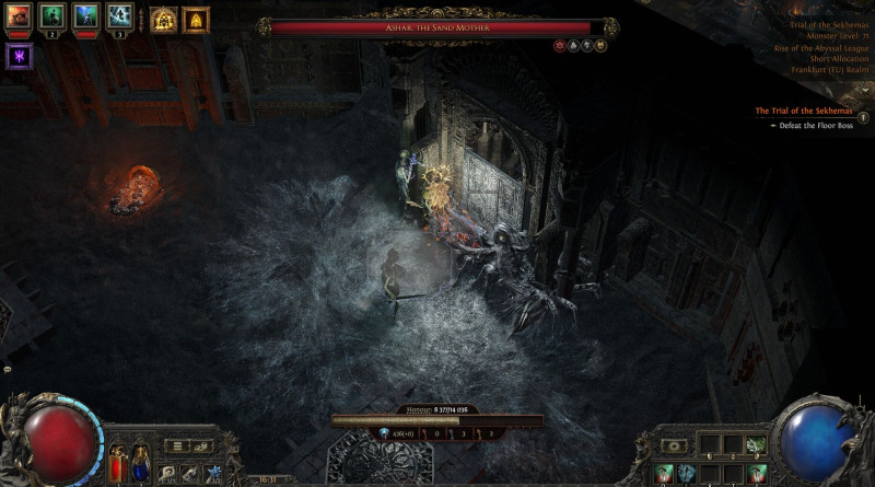 Ettől a Sekhema trialtól még mindíg agyfaszt kapok. Simán eljutok a bosshoz, erre 1 hitel 1 sima spellel (kezéből szórja a villámot körbe-körbe). Ami korábban már többször eltalált és szinte nem is sebzett, úgyhogy most se nagyon akartam kikerülni. Honor meg kb 80%-on állt.