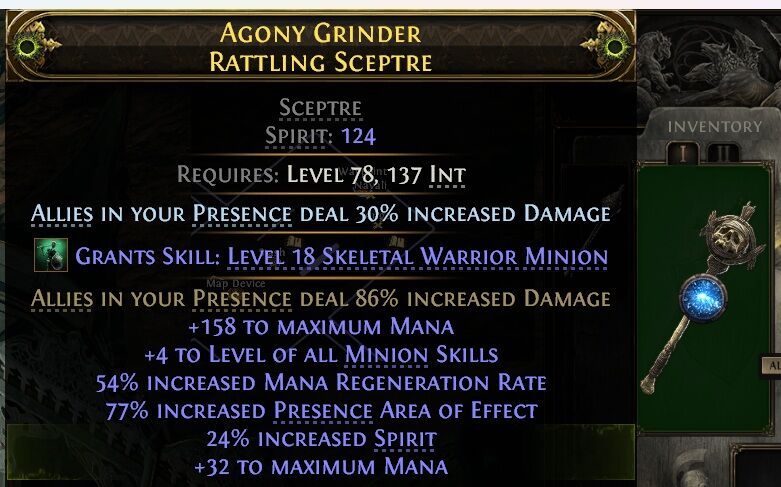 Ha meg sceptert veszel nekem 160 spirittel 100 ex ért azt átveszem tőled simán... bár nekem kell a Rattling, nem a skeleton sebzése a lényeg, hanem hogy azt áldozom be a Pain Offeringel és mondjuk a + dmg se árt rá, meg még pár stat.