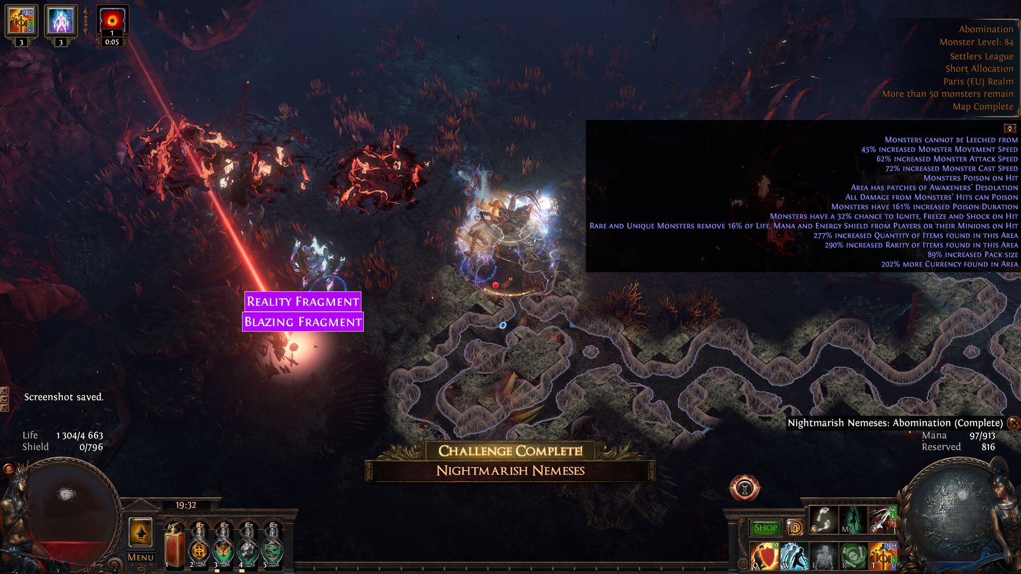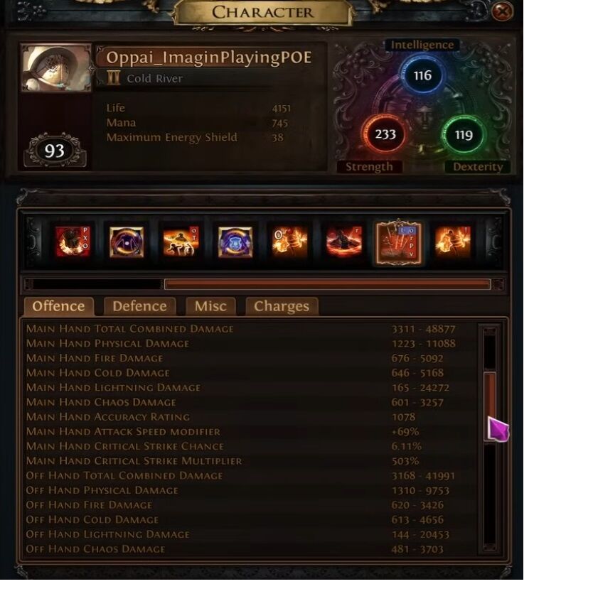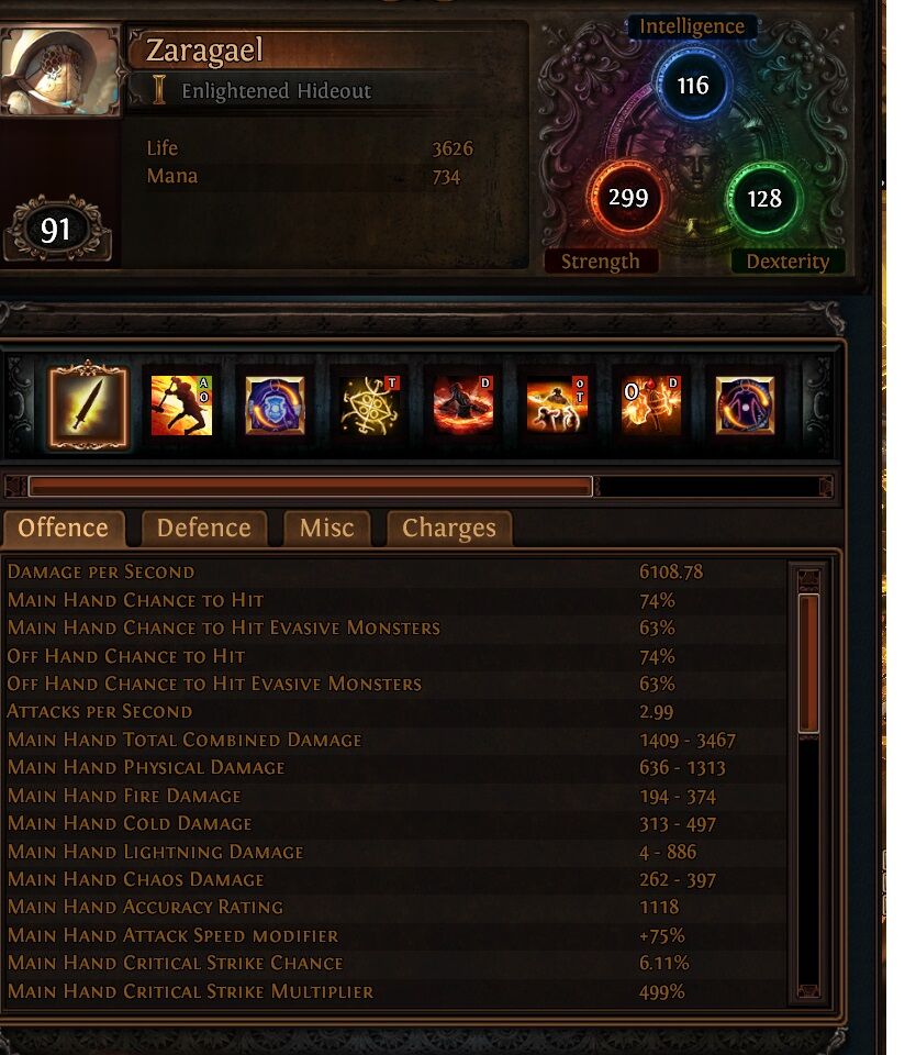 Meg, ahogy Danee is irja, játékmennyiség. 16 incandescent van raktáron x28 map. Scarabokat és t17 mapokat még el sem adtam, de currencyből is jönne még pár div. Meglett minden. Feared, uber elder, összes invitation. Elég lazán vitte. Legnagyobb gondom a mana volt (ha lett volna agyam, berakok egy clarityt), mert egyik gyűrűre még nem sikerült rátenni a craftot. Birja az extra elem dmg-t is, crit dmg-t. Ami nem tetszik neki az az avoid ailments (ha az explicit modok ki vannak maxolva és 90%+), a reduced arm/blockot alapból kerülni szoktam, meg a refl elem dmg. Nem olyan kiegyensúlyozott a védelme, mint a burdennel, de a rare övvel a flaskok végig aktivak maradnak, ha nem állsz meg hosszabb időre. Speed gyors, köszönhetően a frostblinknek és a folyamat akiv onslaughtnak. AoE jó, még jobb lesz, ha a gemeket is teljesen lecseréltem (awa chain pl).