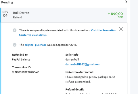 "Vevő nyitott egy item not received ügyet a Paypalon. Megnéztem a trackinget, ami mutatja, hogy december 3-án megkapta a terméket. Mielőtt bármit csinálhattam volna továbbvitte - claim. Majd 1 perc múlva kaptam egy emailt a Paypaltól, hogy a pénzt visszaküldték a vevőnek.
