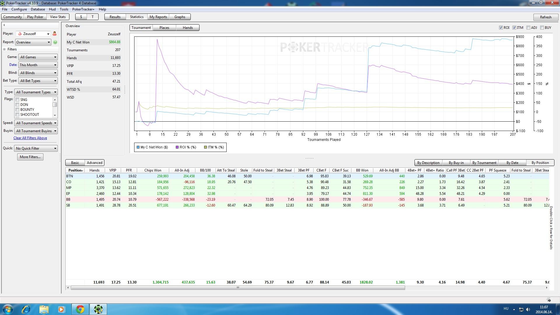 Jó, hogy van ilyen topik is. Ideje volt már ide írnom. Remélem nem bánjátok, ha csatlakozok hozzátok. Rég óta kártyázom, kisebb nagyobb sikerrel. Aztán volt egy nagyobb nyereményem októberben, azóta fejlesztem magam és már lassan a profi szinten tartok. Az utóbbi hónapjaim már nagyon jól alakulnak már szinte ebből élek.Imádom a pókert nap mint nap foglalkozom vele elemzek olvasok és sokat játszom. Szeretnék hozzátok csatlakozni, mert még a mai napig tanulok dolgokat, és akinek kell segítség szívesen nyújtok. Én főleg sng játékos vagyok. itt egy grafikon a júniusomról sajnos elég keveset játszottam, még a hatákonyságon javítani kell, nagyon el vagyok ebben a hónapban maradva.