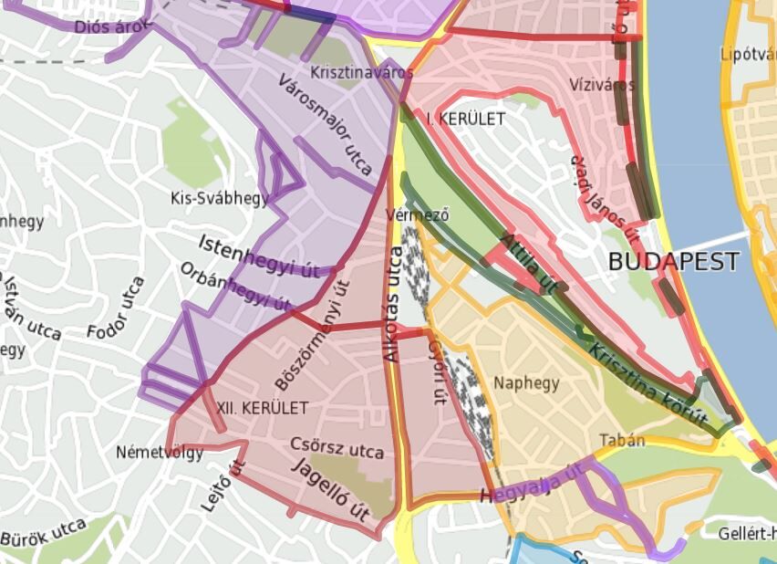 Pár hónapja (szeptember 1-től, ha jól emlékszem) Budapesten jelentősen kiterjesztették a parkolási zónákat, árat is emeltek (nálunk duplázták), és az időszak is nőtt (a 8-18 helyet 8-20, helyenként 8-22 óráig fizetős). A színes foltok díjzónákat jelölnek valószínűleg.