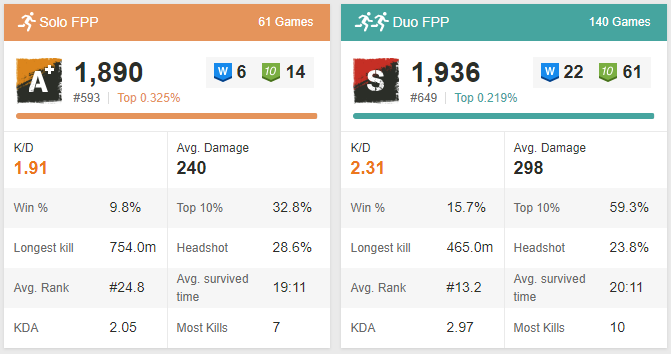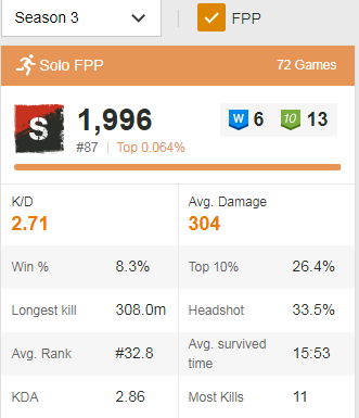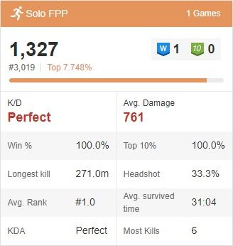 (#16941) ReFleXx: ismerősöm (több 100 óra játékkal) fejtette ki nekem hétvégén, hogy FPP-ben sokkal könnyebb nyerni, mint TPP-ben. Ezt azután fejtegette mikor mondtam neki, hogy amíg nem nyerek egy solo-t TPP-ben addig FPP-t hanyagolom.