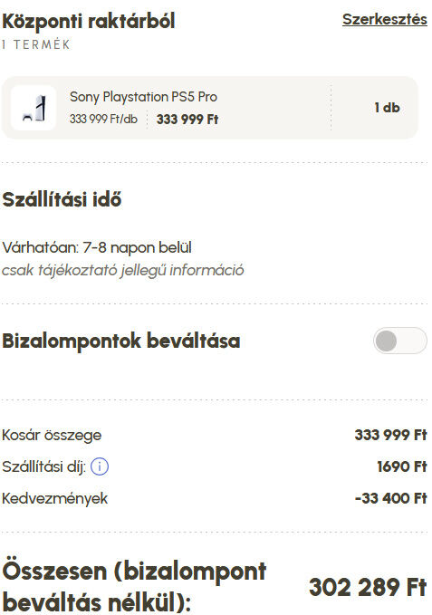 Auchan online áruházban a PS5 Pro bizalomkártyával, "PAR2026HUSVET" kuponkóddal, szállítási díjjal együtt 302.289.-.