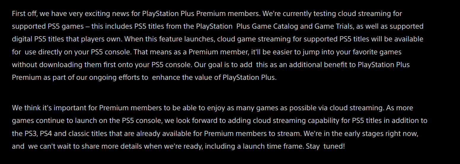 • Digital PS5 games you ownWhen launched, cloud streaming will be directly available on PS5 consoles for PS+ Premium subscribers
