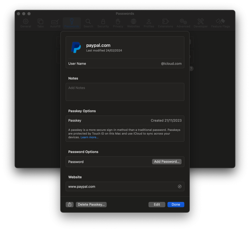 Van egy public Passkey amit az adott oldal táról. A másik a Private Passkey ami nálad van. Ez lehet egy speciális USB Security Key vagy felhőben pl. iCloud. Azonosításhoz biometrikus vagy pin / jelkód kód (stb.) azonosítás szükséges.