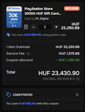 Eneba 12% kupon 60€-ig jó. Sajna a 30k-s feltöltő pont 60.37€, de egy 25k-sra működik.