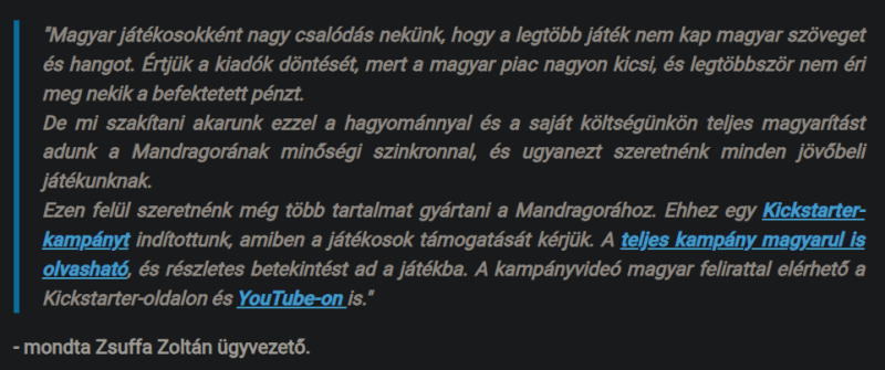 Ja igen és abból is volt balhé, hogy eredetileg fizikai példány járt volna azoknak, akik bizonyos összeget adtak, aztán meg sem jelent a játék úgy, kiszúrták a szemüket kóddal. Aztán a végén csak be kellett ruházniuk arra a lemeznyomtatásra... De ez a legnagyobb cink, hogy így szó nélkül eltűntek, se egy bocsi, vagy sajnálkozás a szinkronnal kapcsolatban, semmi. Meg ugye az, hogy rajongók tudnak csinál(tat)ni szinkront játékokhoz, rendes szinkronszínészekkel, ezeknek meg nem ment a saját játékukhoz...
