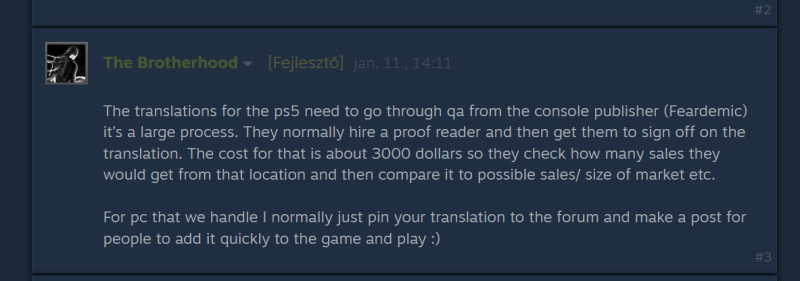 Ezt egy fejlesztő írta nekem, hogy mennyibe fáj egy lokalizáció PS5-re és ez egy indie játék. Na hát ezért nincs sok játékban magyar nyelv.... -