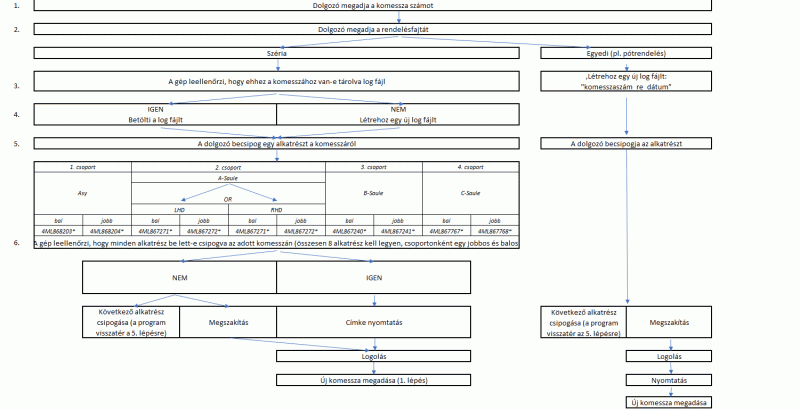 A legfontosabb a visszaolvashatóság lenne. A ciklus elején amikor beírja a kom. számot ellenőrizni kell van-e nyitott viszgálat. (nincs levizsgálva mind a 8 féle alkatrész)
