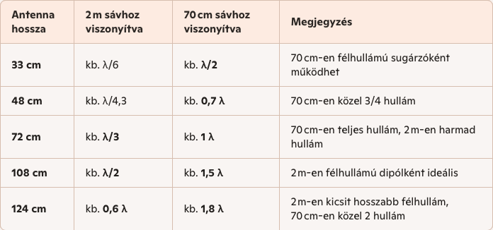 A 70 cm-es sávon a 33 cm-es (félhullám) és a 72 cm-es (egész hullám) ad jó illeszkedést.Forrás: Copilot