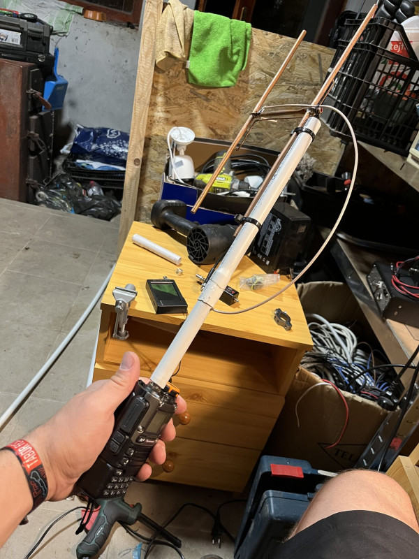 Ma fabrikáltam egy rádióra szerelhető körsugárzót, az swr-t a harmadik tologatásra sikerült 1,02-re állítani. A gyáritól jobb, de itthonról nem tudom tovább tesztelni, hogy melyik a győztes. [kép] -