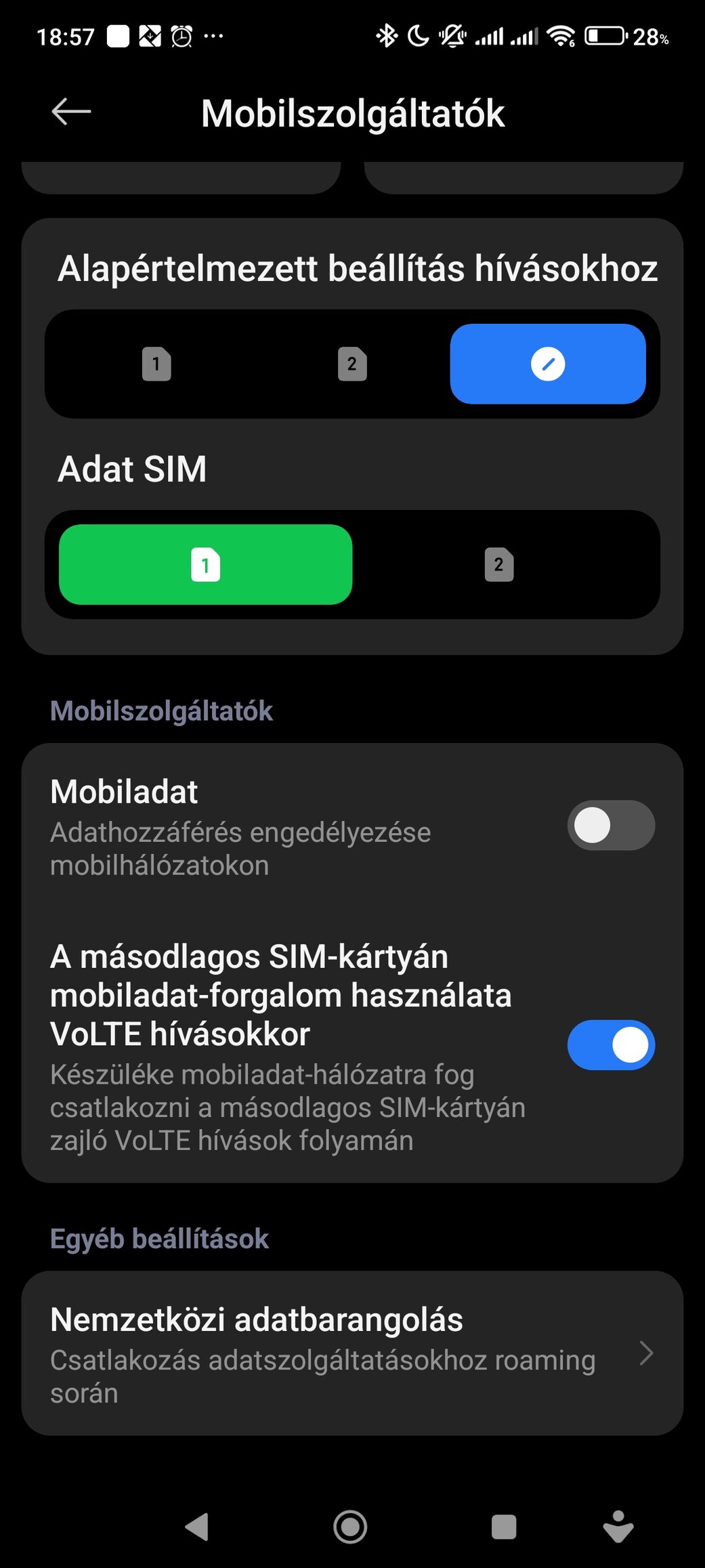 Sziasztok. Valaki meg tudná mondani, hogy hol lehet az alapértelmezett SIM-et kiválasztani SMS küldéshez? Elvileg a Mobilhálózatok menüben kellene lennie, de nekem nincs. [kép]