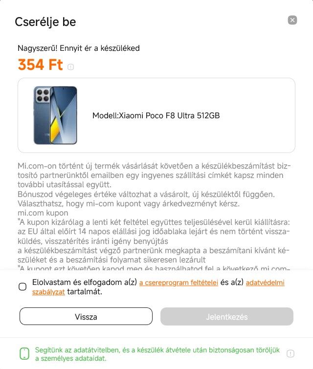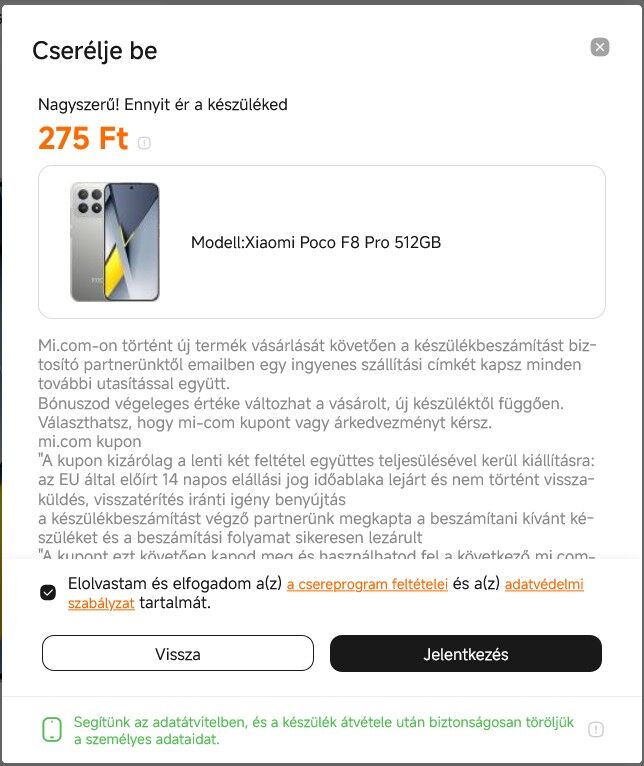 Meg tudod nézni, ha elindítod a vásárlást be lehet írni a típust, de nem minden telefont fogad és nagyon keveset ajánl érte. Nekem a 12/512 tökéletes állapotú Poco F6-ért talán 20 ezret akart adni. Ráadásul akkor nem tudtam volna így átköltözni se, mert azt oda kell adni mikor hozzák az újat és le kell resetelni előtte.