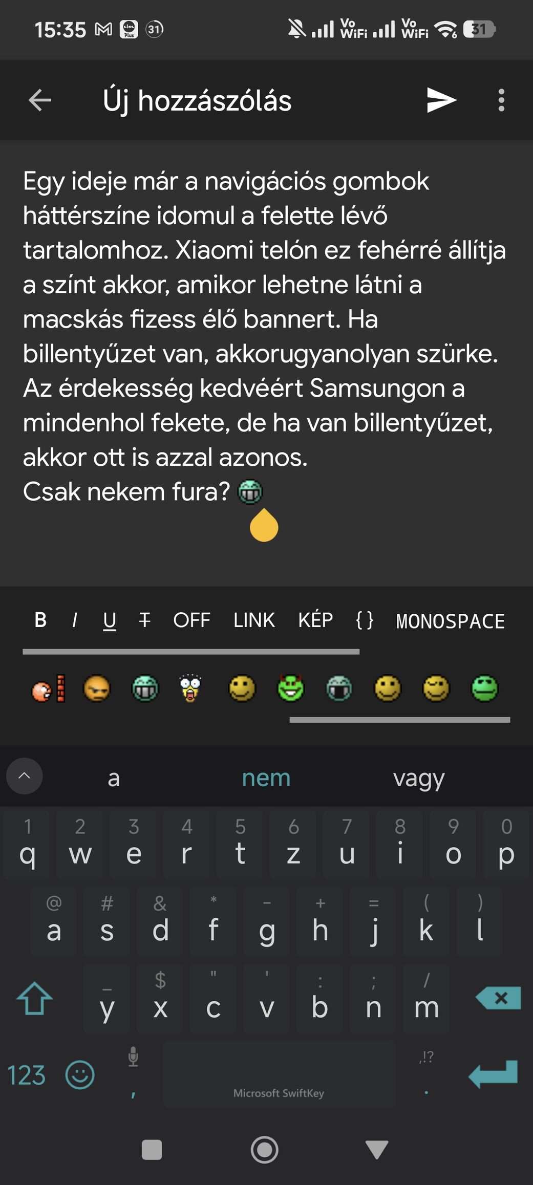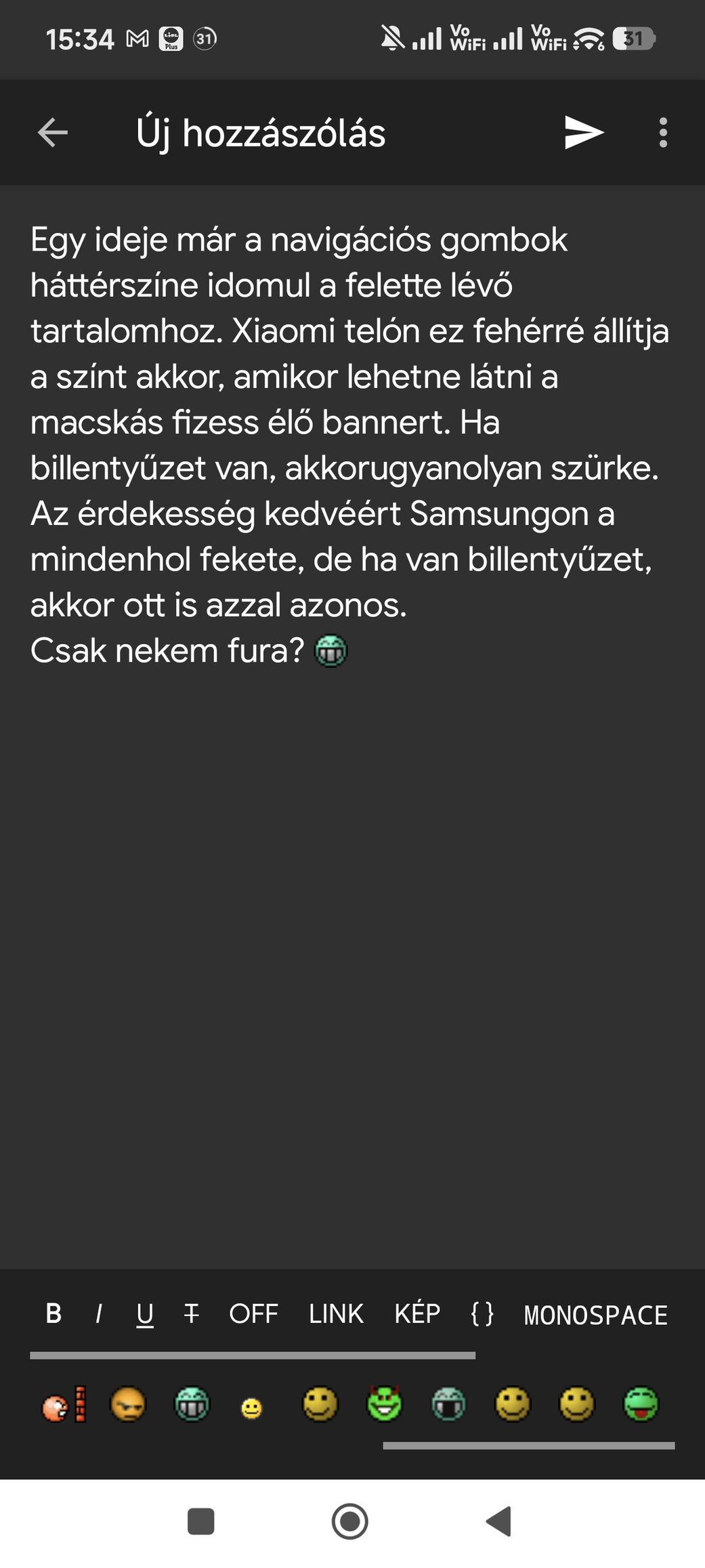 Egy ideje már a navigációs gombok háttérszíne idomul a felette lévő tartalomhoz. Xiaomi telón ez fehérré állítja a színt akkor, amikor lehetne látni a macskás fizess élő bannert. Ha billentyűzet van, akkor ugyanolyan szürke mint a bill.